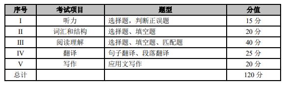 考试项目共有五个部分,即听力、词汇和结构、阅读理解、翻译和写作。各部分测试题型和分值如下:
